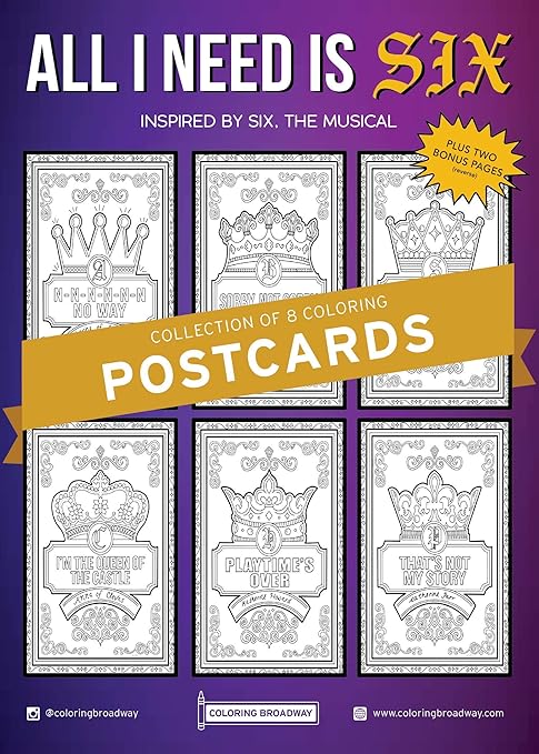 Postcards and note cards fit a 5 x 7 frame, pages fit an 8.5 x 11 frame perfectly. These high quality pages are printed on 65# smooth matte card stock. Use #coloringbroadway and tag us on ig and fb (@coloringbroadway). Then you can print it out and color! To clarify the list of pictures that you see: